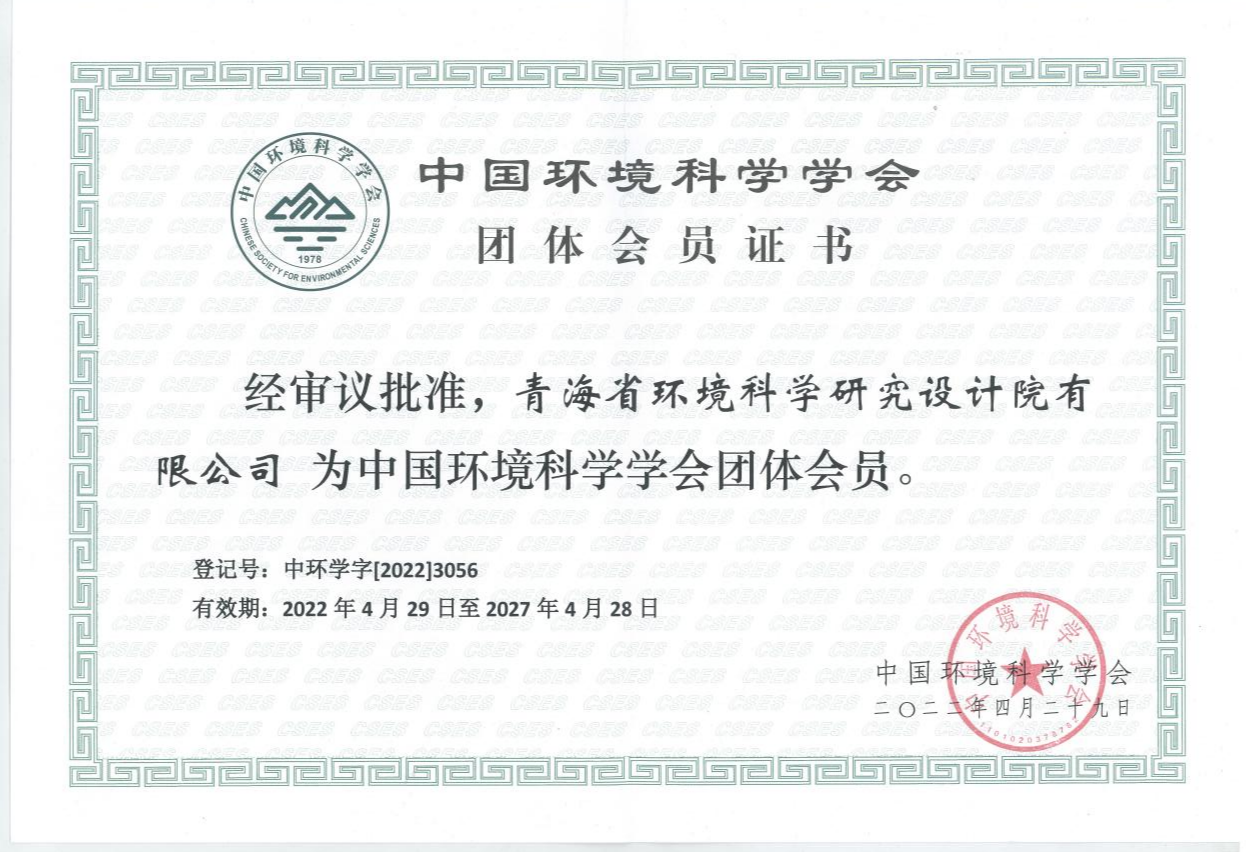 中國(guó)環(huán)境科學(xué)學(xué)會(huì)團(tuán)體會(huì)員證書,中國(guó)環(huán)境科學(xué)學(xué)會(huì)頒發(fā),2022年4月29日