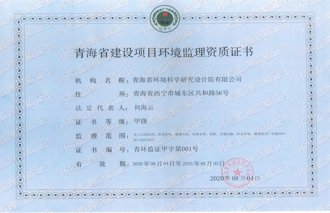 《青海省建設(shè)項(xiàng)目環(huán)境監(jiān)理資質(zhì)證書》,甲級(jí)資質(zhì),青海省環(huán)境保護(hù)產(chǎn)業(yè)協(xié)會(huì)頒發(fā),2020年8月4日
