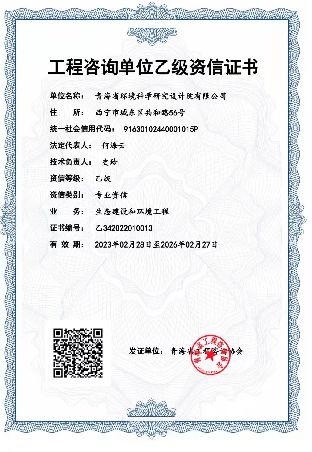 《工程咨詢單位乙級(jí)資信證書》,青海省工程咨詢咨詢協(xié)會(huì)頒發(fā),2023年2月8日