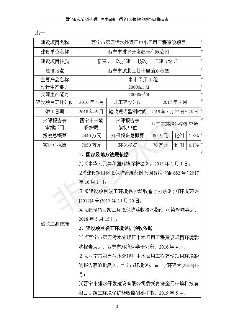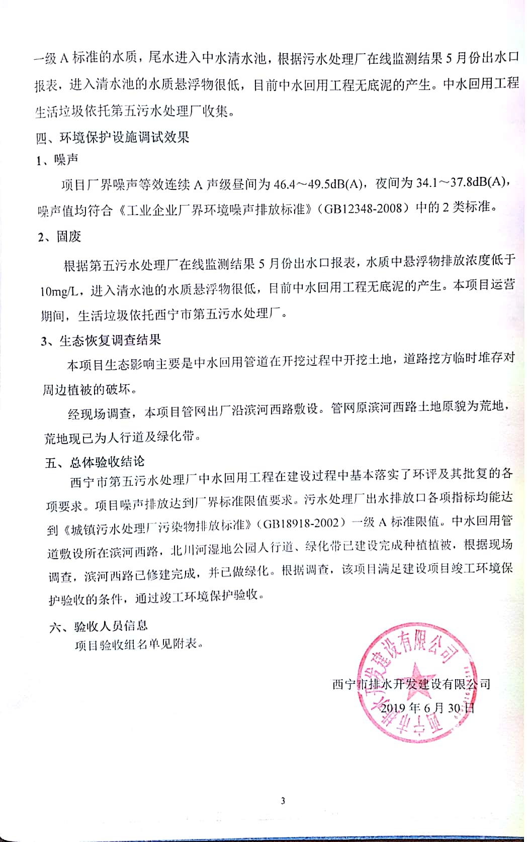 西寧市第五污水處理廠中水回用工程建設項目竣工環(huán)境保護驗收監(jiān)測報告表公示發(fā)布日期:(2019-7-10) 點擊次數:2396 |