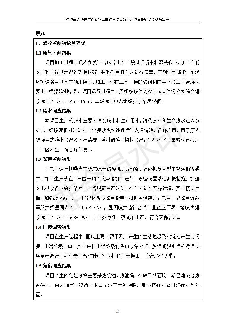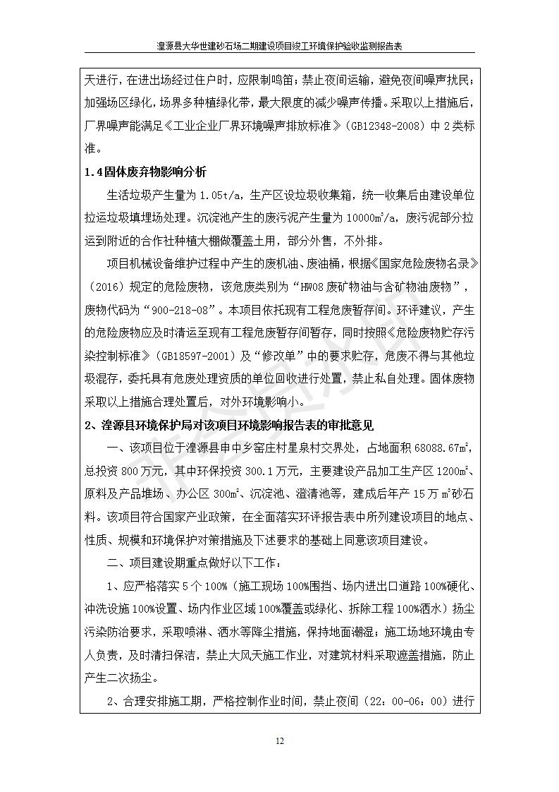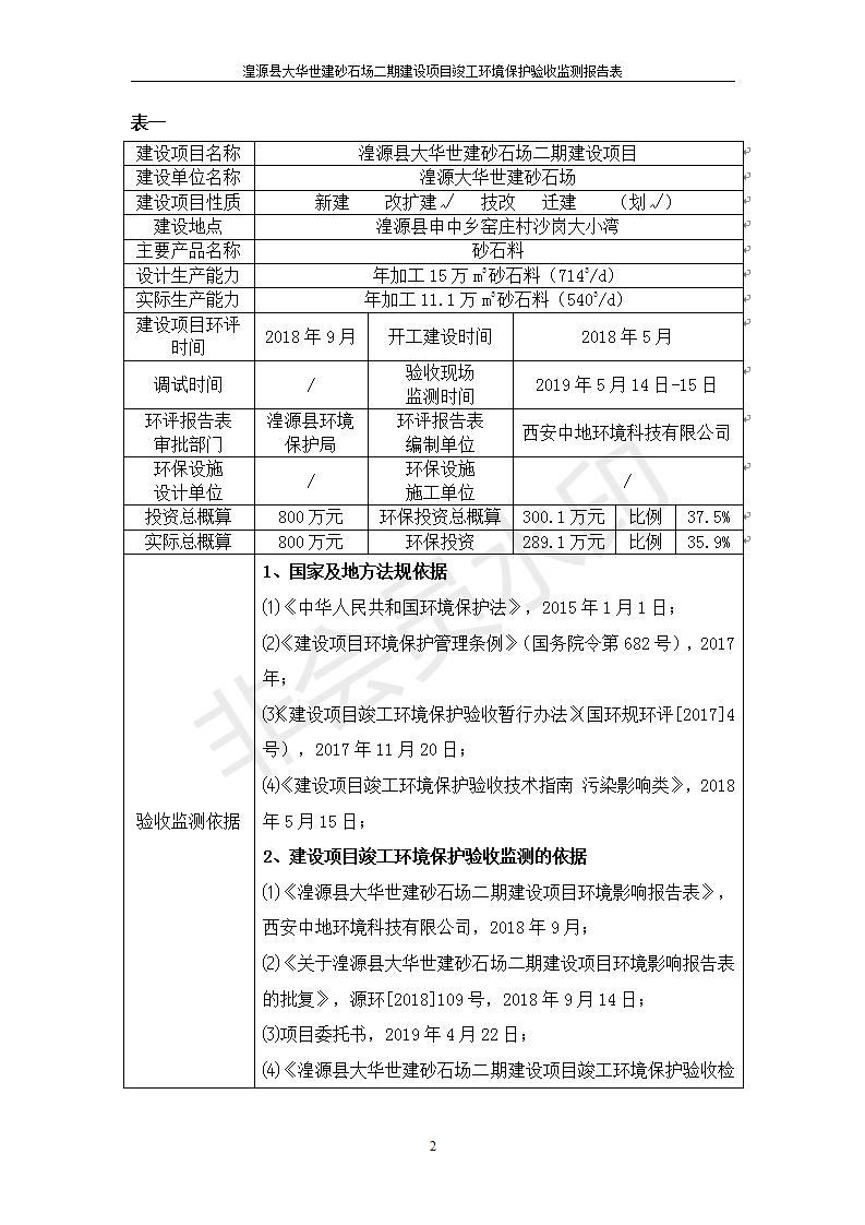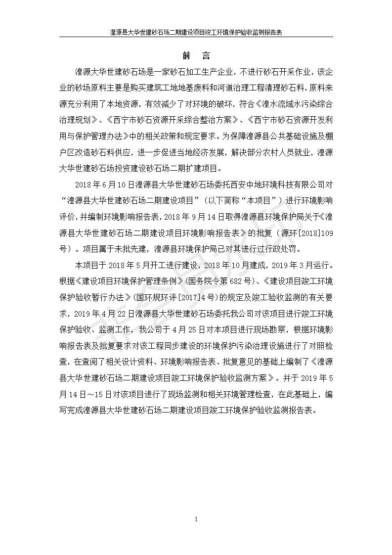 根據(jù)中華人民共和國國務(wù)院令第682號《國務(wù)院關(guān)于修改〈建設(shè)項(xiàng)目環(huán)境保護(hù)管理?xiàng)l例〉的決定》和《建設(shè)項(xiàng)目竣工環(huán)境保護(hù)驗(yàn)收暫行辦法》(國務(wù)院令682號),湟源大華世建砂石場湟源縣大華世建砂石場二期建設(shè)項(xiàng)目(包括竣工環(huán)境保護(hù)驗(yàn)收監(jiān)測報(bào)告表和驗(yàn)收意見)公示如下。 一、項(xiàng)目名稱:湟源縣大華世建砂石場二期建設(shè)項(xiàng)目 二、地點(diǎn):湟源縣申中鄉(xiāng)窯莊村沙崗大小灣 三、建設(shè)單位:湟源大華世建砂石場 四、建設(shè)內(nèi)容:項(xiàng)目主要建設(shè)砂石料產(chǎn)品加工生產(chǎn)區(qū)、原料堆場、產(chǎn)品堆場、辦公區(qū)等。五、聯(lián)系人:張工 六、聯(lián)系電 話:0971-6515411 七、公示時(shí)間:二〇一九年七月二十五日至二〇一九年八月二十一日公示期間,對上述公示內(nèi)容如有異議,請以書面形式反饋,個(gè)人須署真實(shí)姓名,單位須加蓋公章。