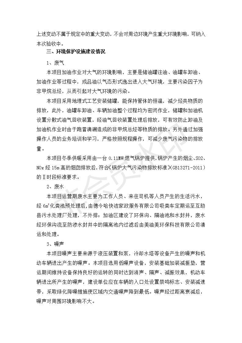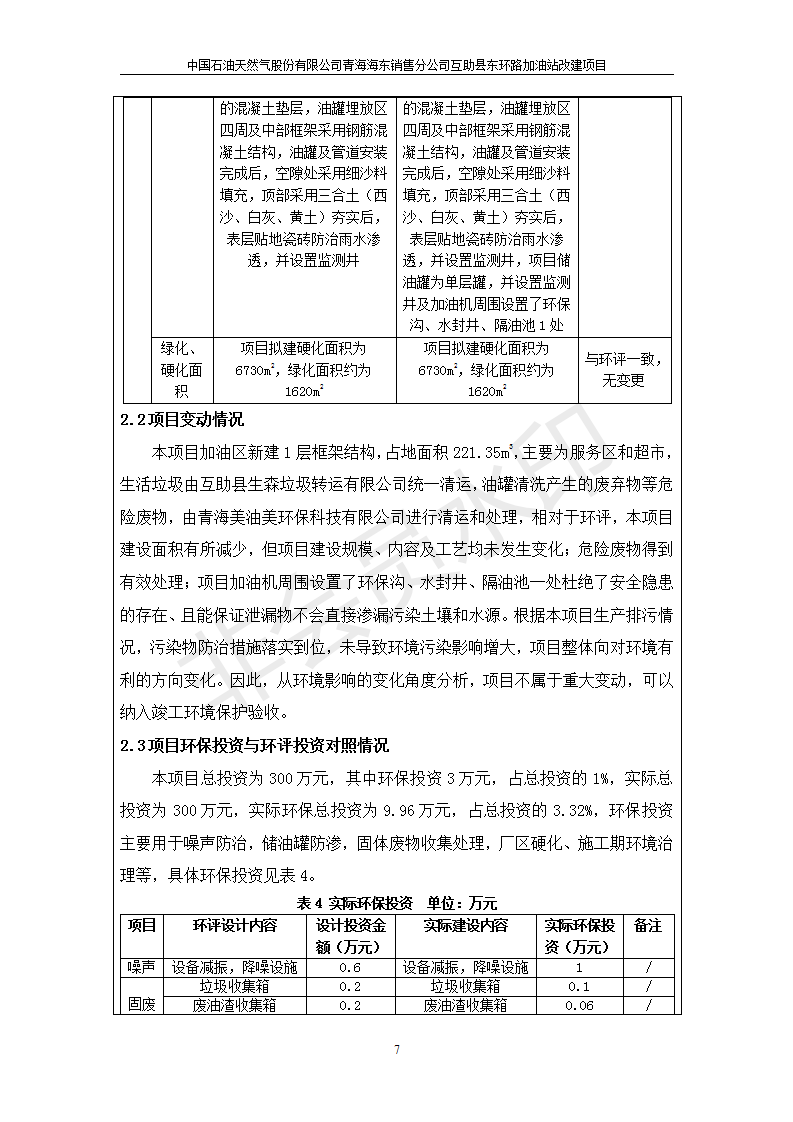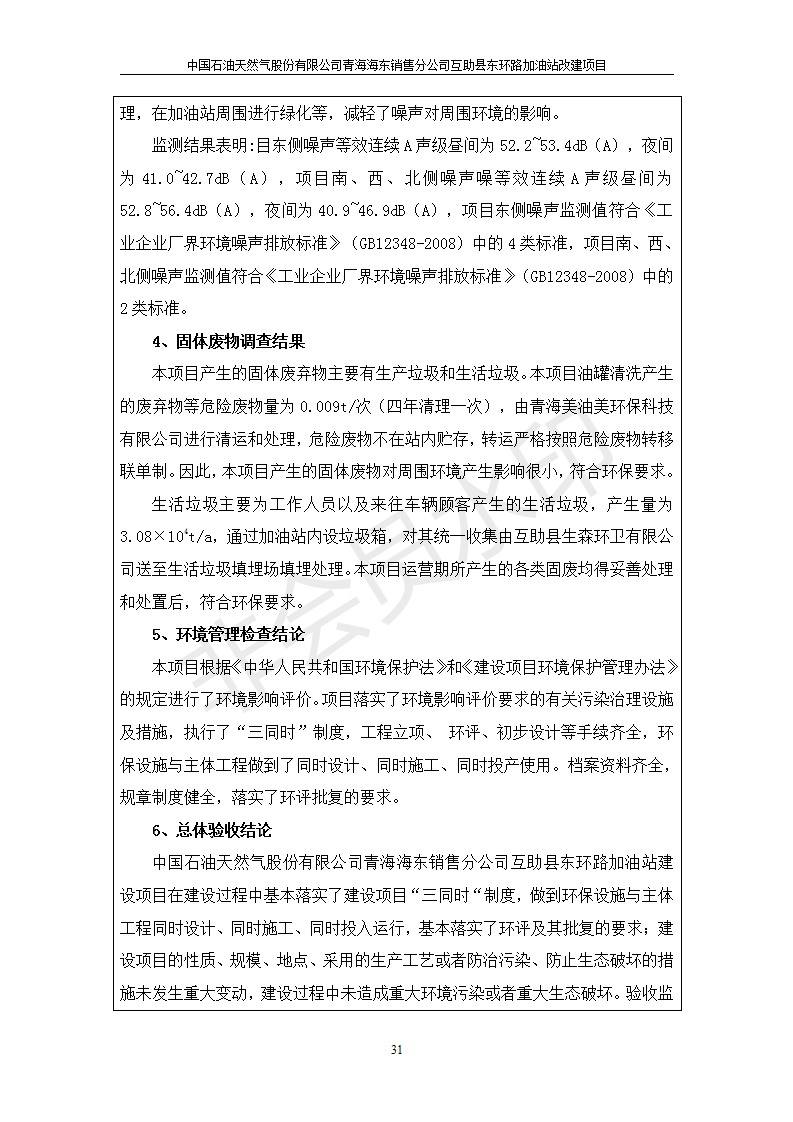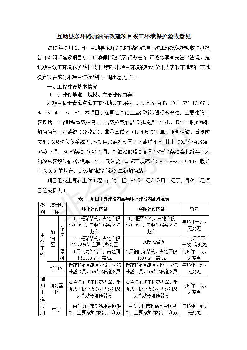 根據(jù)中華人民共和國國務院令第682號《國務院關于修改〈建設項目環(huán)境保護管理條例〉的決定》和《建設項目竣工環(huán)境保護驗收暫行辦法》(國務院令682號),互助縣東環(huán)路加油站改建項目(包括竣工環(huán)境保護驗收監(jiān)測報告表和驗收意見)公示如下。 一、項目名稱:互助縣東環(huán)路加油站改建項目 二、地點:青海省海東市互助縣東環(huán)路 六、聯(lián)系電話:0971-6515411 七、公示時間:二〇一九年九月二十七日至二〇一九年十月二十九日 公示期間,對上述公示內容如有異議,請以書面形式反饋,個人須署真實姓名,單位須加蓋公章。