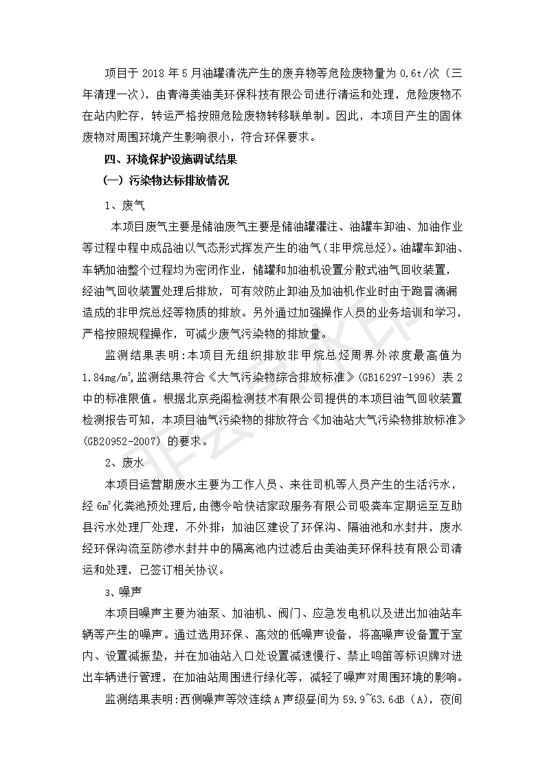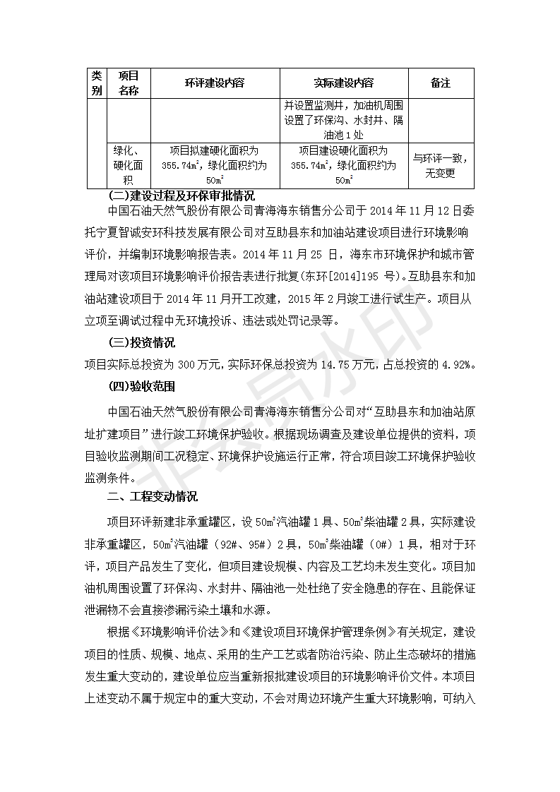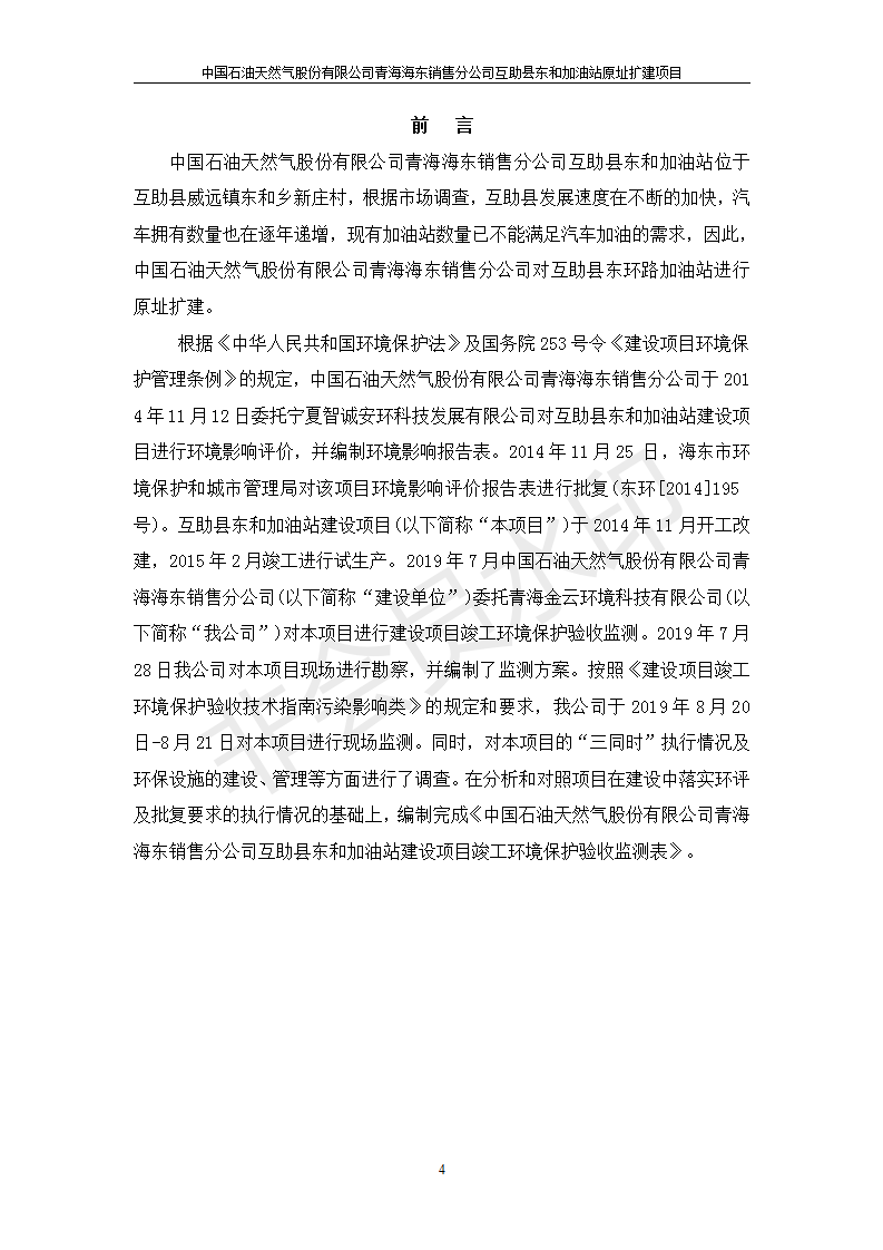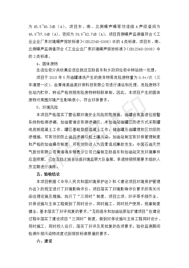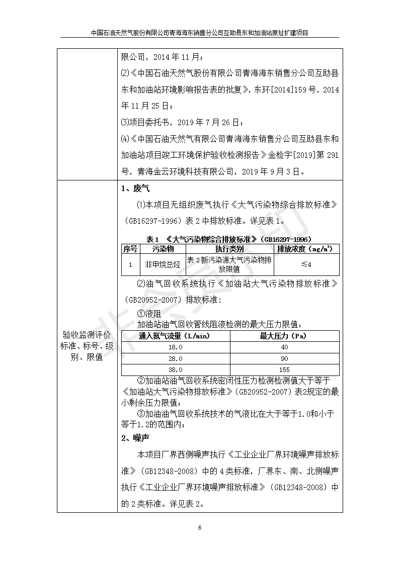 根據(jù)中華人民共和國國務(wù)院令第682號《國務(wù)院關(guān)于修改〈建設(shè)項目環(huán)境保護(hù)管理條例〉的決定》和《建設(shè)項目竣工環(huán)境保護(hù)驗收暫行辦法》(國務(wù)院令682號),互助縣東和加油站原址擴(kuò)建項目(包括竣工環(huán)境保護(hù)驗收監(jiān)測報告表和驗收意見)公示如下。 一、項目名稱:互助縣東和加油站原址擴(kuò)建項目 二、地點:互助縣威遠(yuǎn)鎮(zhèn)東和鄉(xiāng)新莊村 六、聯(lián)系電話:0971-6515411 七、公示時間:二〇一九年九月二十七日至二〇一九年十月二十九日 公示期間,對上述公示內(nèi)容如有異議,請以書面形式反饋,個人須署真實姓名,單位須加蓋公章。