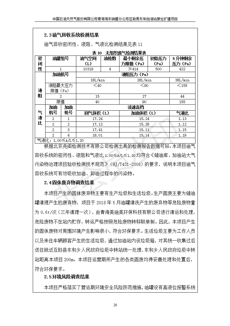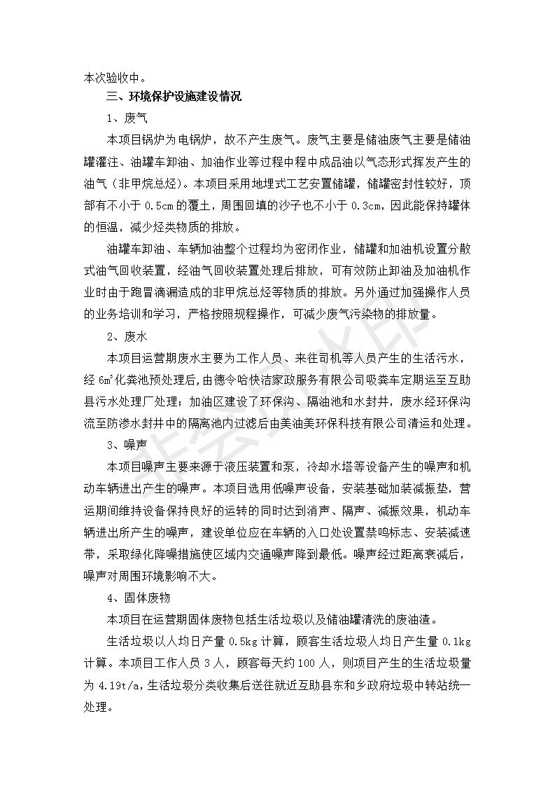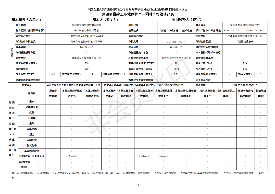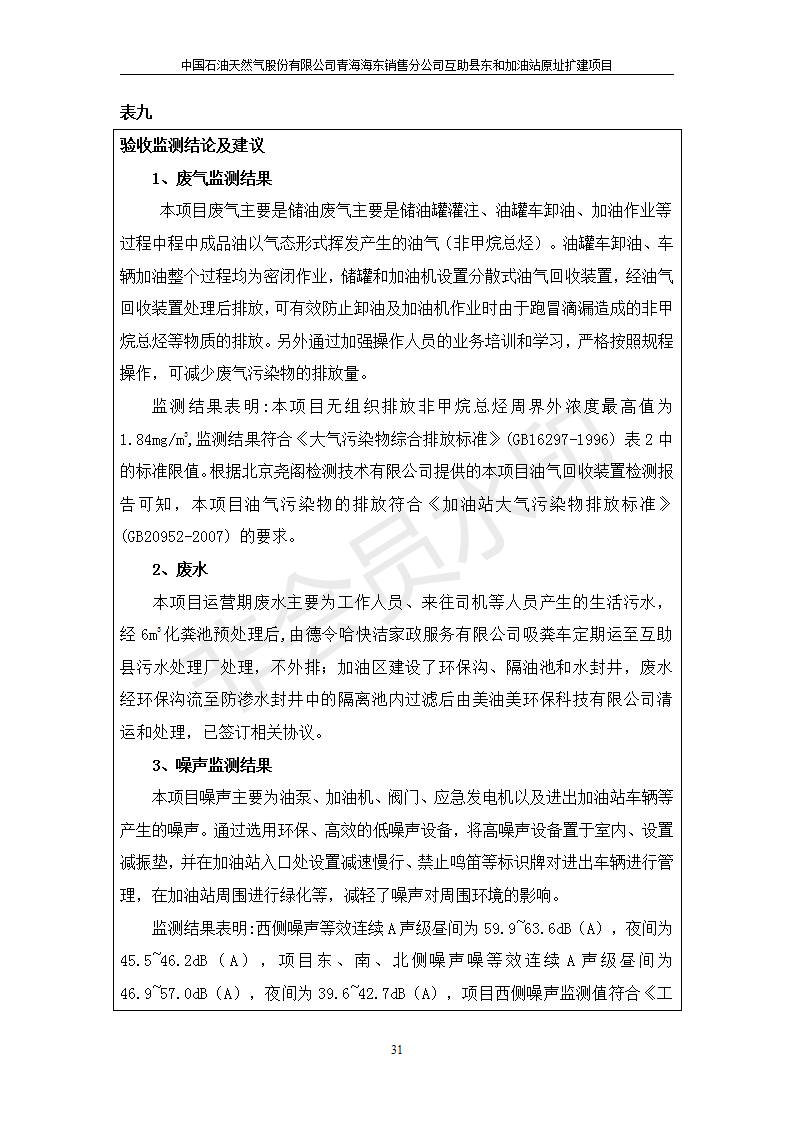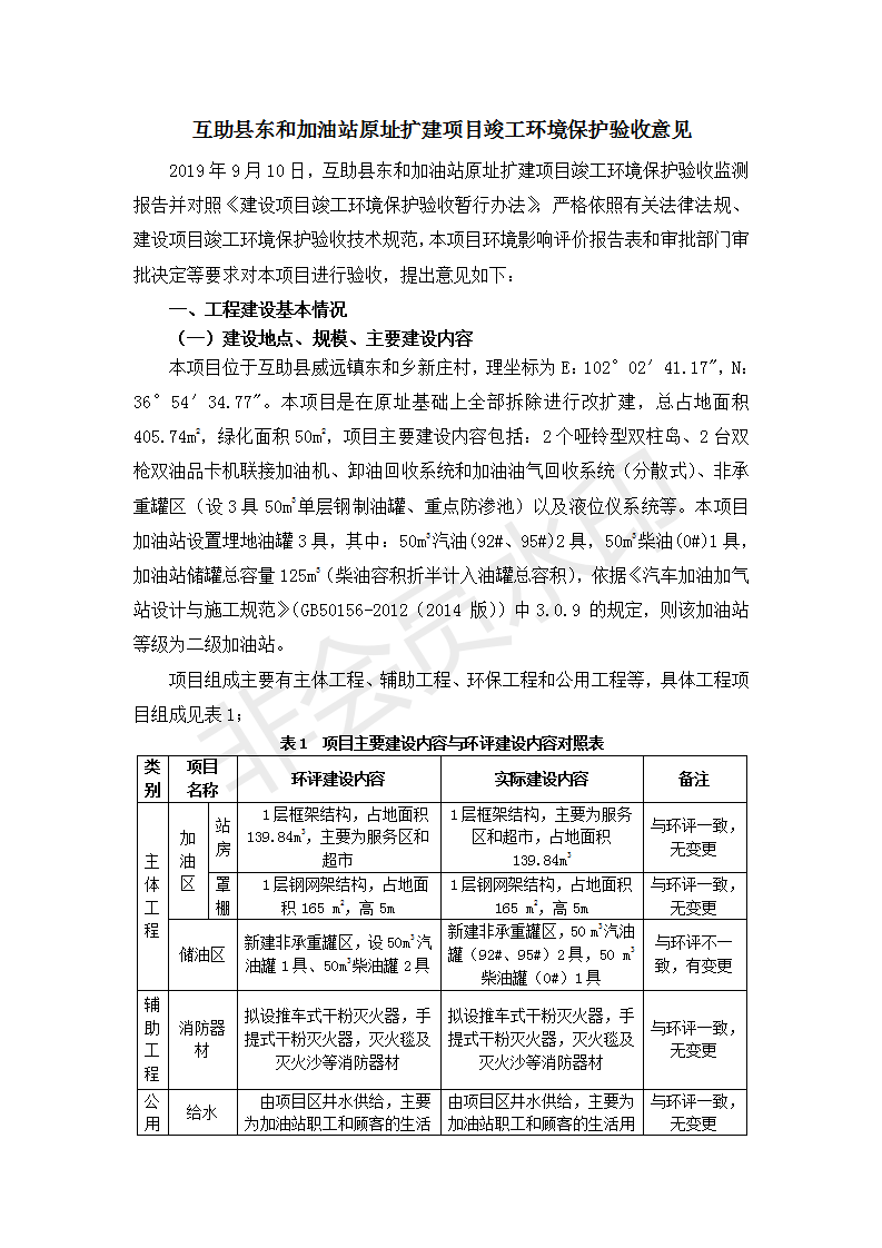 根據(jù)中華人民共和國國務(wù)院令第682號《國務(wù)院關(guān)于修改〈建設(shè)項目環(huán)境保護(hù)管理條例〉的決定》和《建設(shè)項目竣工環(huán)境保護(hù)驗收暫行辦法》(國務(wù)院令682號),互助縣東和加油站原址擴(kuò)建項目(包括竣工環(huán)境保護(hù)驗收監(jiān)測報告表和驗收意見)公示如下。 一、項目名稱:互助縣東和加油站原址擴(kuò)建項目 二、地點:互助縣威遠(yuǎn)鎮(zhèn)東和鄉(xiāng)新莊村 六、聯(lián)系電話:0971-6515411 七、公示時間:二〇一九年九月二十七日至二〇一九年十月二十九日 公示期間,對上述公示內(nèi)容如有異議,請以書面形式反饋,個人須署真實姓名,單位須加蓋公章。
