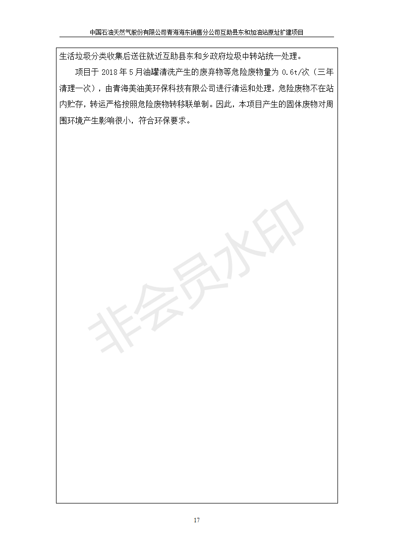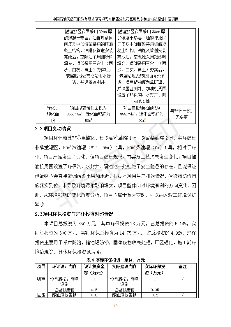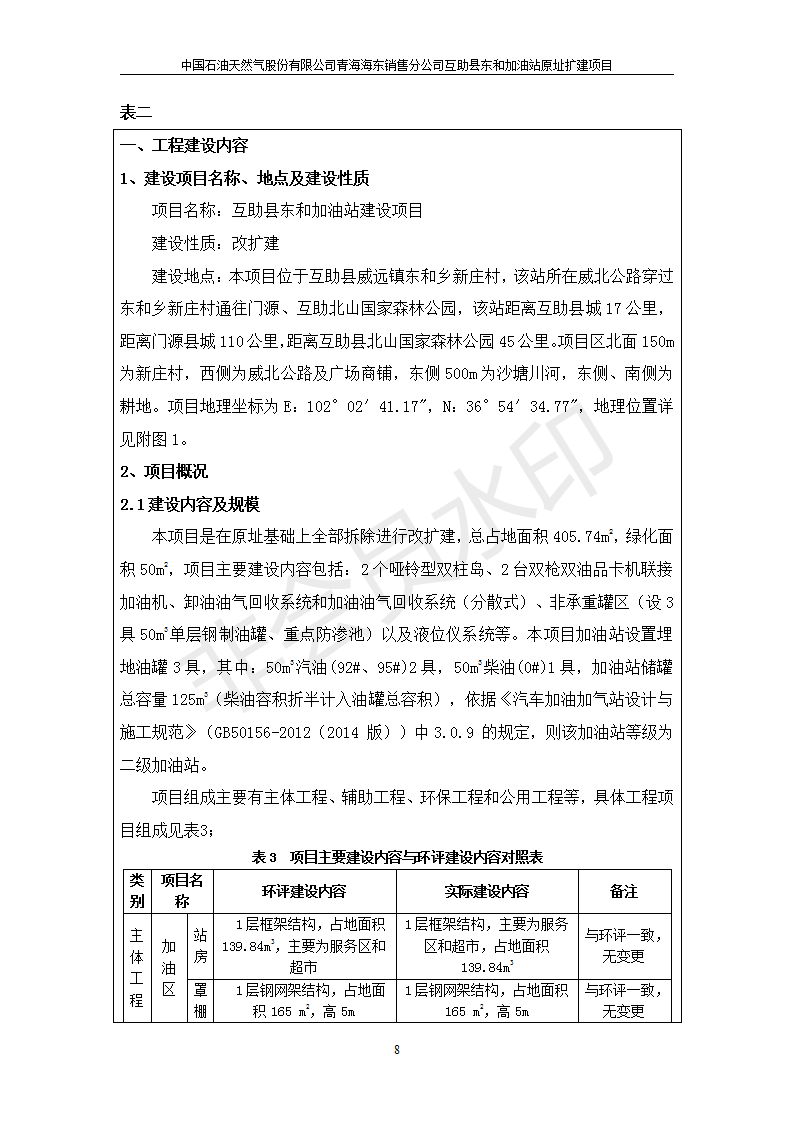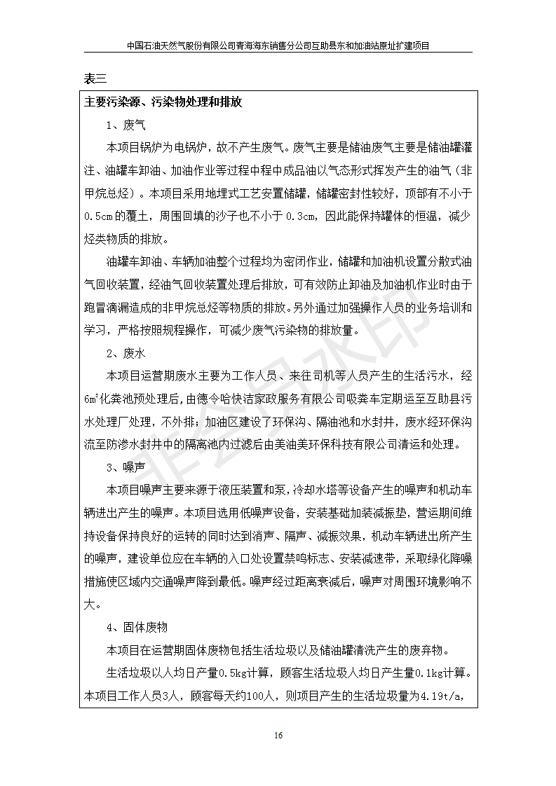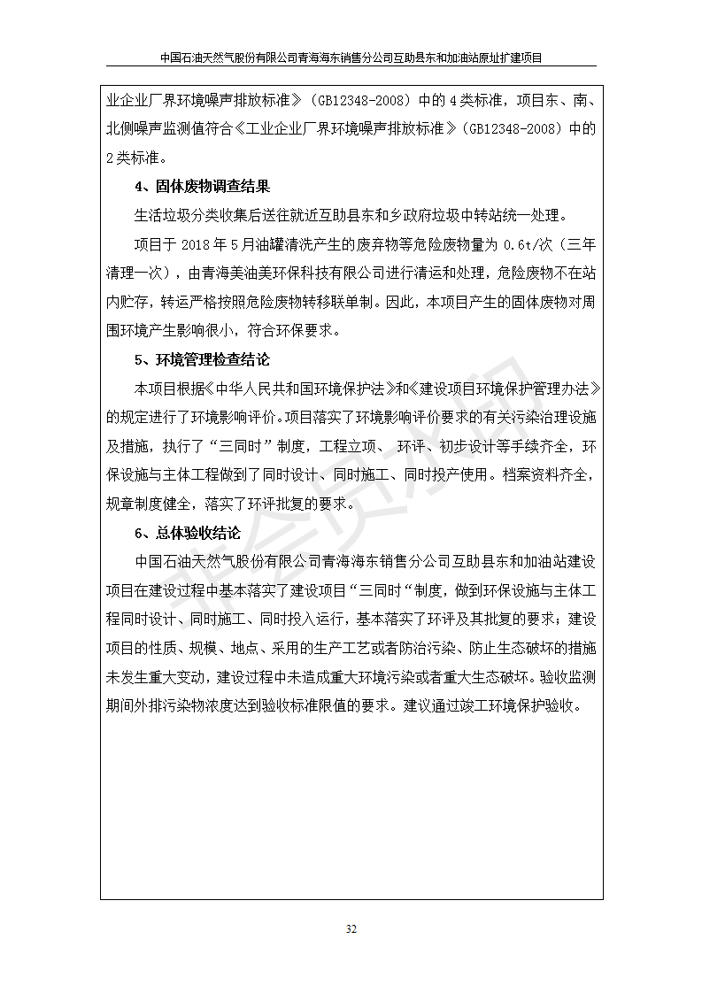 根據(jù)中華人民共和國國務(wù)院令第682號《國務(wù)院關(guān)于修改〈建設(shè)項目環(huán)境保護(hù)管理條例〉的決定》和《建設(shè)項目竣工環(huán)境保護(hù)驗收暫行辦法》(國務(wù)院令682號),互助縣東和加油站原址擴(kuò)建項目(包括竣工環(huán)境保護(hù)驗收監(jiān)測報告表和驗收意見)公示如下。 一、項目名稱:互助縣東和加油站原址擴(kuò)建項目 二、地點:互助縣威遠(yuǎn)鎮(zhèn)東和鄉(xiāng)新莊村 六、聯(lián)系電話:0971-6515411 七、公示時間:二〇一九年九月二十七日至二〇一九年十月二十九日 公示期間,對上述公示內(nèi)容如有異議,請以書面形式反饋,個人須署真實姓名,單位須加蓋公章。